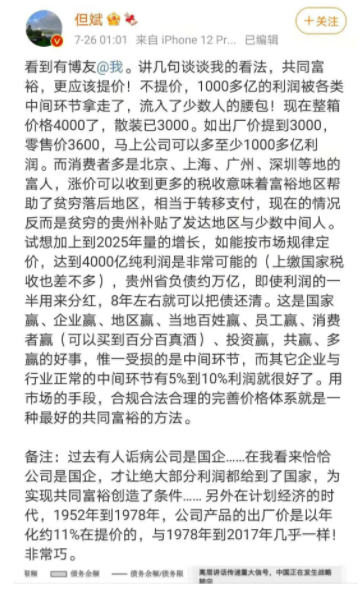 微博中,但斌称,茅台提价,是国家赢、企业赢、地区赢、当地百姓赢、员工赢、消费者赢(可以买到百分百真酒)、投资赢,共赢、多赢的好事。