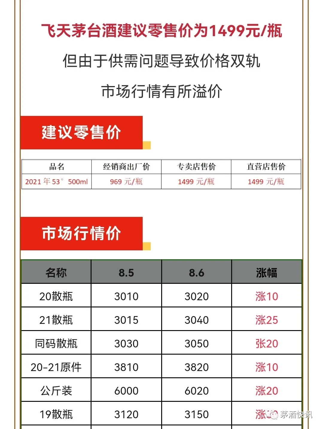 在某酒水比价公众号中,2021年散瓶茅台8月5日的报价为3015元,8月6日的报价则为3040元,上涨25元;2020年-2021年的原箱单瓶报价在8月6日高达3820元,8月5日的报价则为3810元。