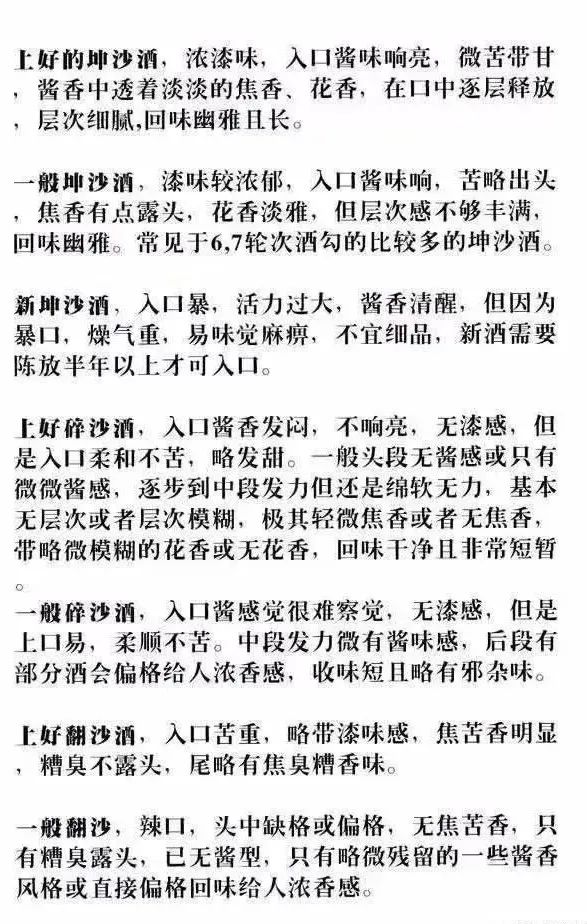 碎沙酒、翻沙酒:入口味杂,水味偏重,相比坤沙酒口感略散乱。各种味道混在一起,没有重点,缺乏层次。