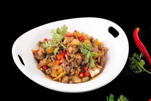 湘菜的最佳拍档是酱香型白酒,酱香型白酒属大曲酒类,主要产自贵州,以高粱、小麦等为原料,经传统固态法发酵制成。其酱香突出,优雅细致,酒体醇厚,余味悠长,清澈透明,色泽微黄。带有浓郁湘菜风味的干锅鸡,以新鲜嫩土鸡为主料,先精心卤制让调料汁全部渗入鸡肉,后大火煮熟,再以小火煨制。成菜色泽艳丽,肉质鲜美,口感香辣,与甘美回味、香味厚重的酱香型白酒搭配,在口中交织出馥郁的香气,在辣味的衬托下白酒口感更加柔顺,余味悠长。